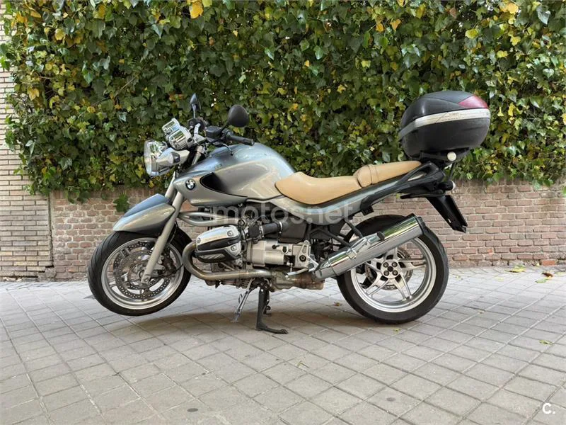 Moto BMW R850R en color gris y beige. Modelo naked de 2005. ITV recién pasada y revisión y mantenimiento BMW hace una semana. - 53280 Km. - Baúl Givi monokey. - En perfecto estado. - Retapizada. - Limitada para el carnet A2.